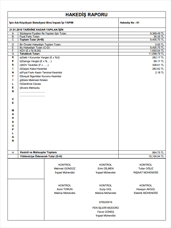 - Arka kapak: Sözleşme fiyatları ile yapılan işin tutarı, fiyat farkı hesabı, tahakkuk tutarı, kesintiler ve yükleniciye ödenmesi gereken tutarın gösterildiği rapordur.
